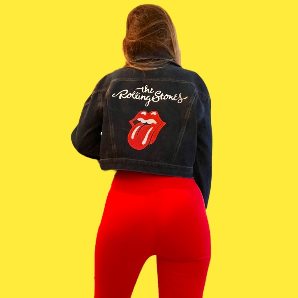 Campera corte biker a la cintura de jean azul, estampa Rolling Stones en espalda. Talles 36 al 44.
